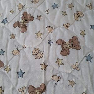 1986 Precious Moments Boy w/ Teddy Bear Quilted Crib Comforter Eyelet Trim ~ Reversible 42x33