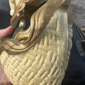 • Ivory resin with metallic gold manes; woven basket pockets.