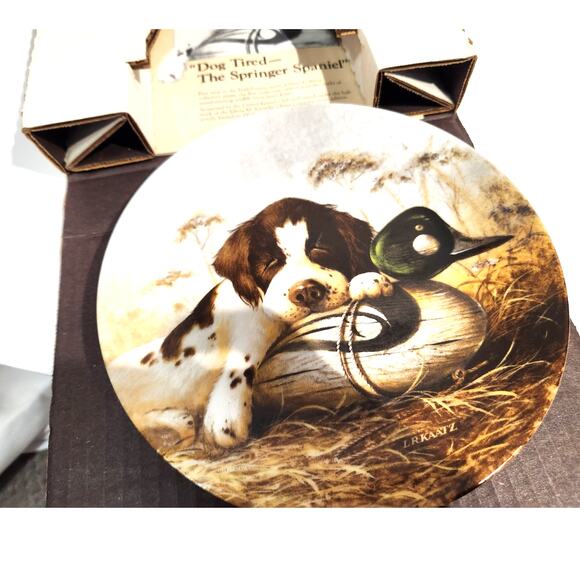 Enjoy this rare find of the 1987 Edwin Knowles Dog Tired Springer Spaniel Collectible Plate 1st Issue. 🐶This sweet little collectible spaniel napping on a wooden duck was created by artist Lynn Kaatz and fired at the Endwin M. Knowles China Company, Norther America's oldest fine China company.