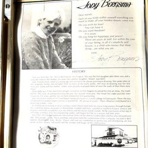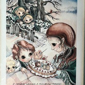 Jody Bergsma's watercolor painted in 1987, depicts a mother embroidering "I Love You Always" while her child watches. The poem across the front of her painting reads: "A mother weaves a rainbow thread into a young child's soul . . . Until it forms a beautiful cloak to keep their hearts warm when they go." Features artist's signature below the poem.