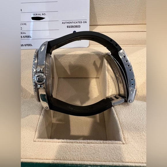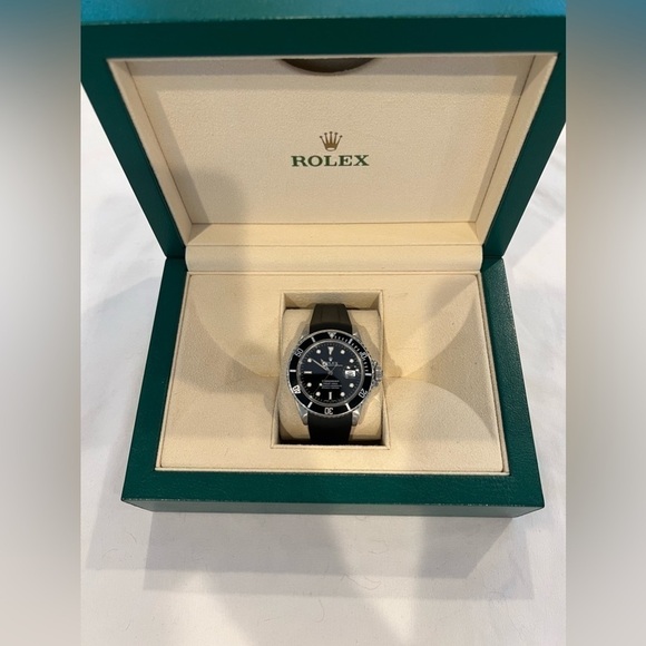 The submariner vintage Rolex watch, featuring a black rubber B strap with original clasp, combines sophistication with a touch of ruggedness. The stainless steel case seamlessly integrates with the black dial, creating a sleek and stylish appearance. The black bracelet complements the overall design, offering a subtle contrast while maintaining a classic aesthetic. This timepiece not only represents the heritage of Rolex but also embodies a timeless and versatile accessory for any occasion.