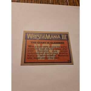 Vintage 1987 Titan Sports Inc. Topps Chewing Gum Inc. trading card printed in the USA, card number 54. The front features WrestleMania III with Hulk Hogan body slamming Andre the Giant, captioned “The Giant is Slammed.” The back reads, “WrestleMania III – The Giant is slammed with a crash heard around the world. Andre the Giant hits the canvas after WWF Champion Hulk Hogan body slammed him in their WrestleMania III confrontation Moments later, Hogan pinned the Giant.” This card is raw and ungraded. I am not a professional trading card dealer What you see is exactly what you get—the picture shown is the exact card you will receive Please check photos carefully for condition The card has been handled and circulated with typical wear