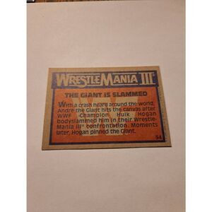 Vintage 1987 Titan Sports Inc. Topps Chewing Gum Inc. trading card printed in the USA, card number 54. The front features WrestleMania III with Hulk Hogan body slamming Andre the Giant, captioned “The Giant is Slammed.” The back reads, “WrestleMania III – The Giant is slammed with a crash heard around the world. Andre the Giant hits the canvas after WWF Champion Hulk Hogan body slammed him in their WrestleMania III confrontation Moments later, Hogan pinned the Giant.” This card is raw and ungraded. I am not a professional trading card dealer What you see is exactly what you get—the picture shown is the exact card you will receive Please check photos carefully for condition The card has been handled and circulated with typical wear