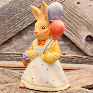 1987 Vintage Lefton-Ceramic Bisque Bunny-Balloons and Basket of a Flowers-5.5”H