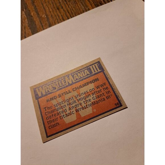 Vintage 1987 Titan Sports Inc. / Topps Chewing Gum Inc. trading card, number 56. Features Hulk Hogan with spotlight shining down in the ring after WrestleMania III with the caption “And Still Champion.” Back of card reads: “WrestleMania III and still champion, the spotlight shines on WWF Champion Hulk Hogan after he defeated Andre the Giant in their Titanic WrestleMania III clash.”