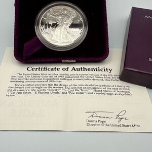 Stunning 1987-S Proof American Silver Eagle in pristine condition. Includes the original US Mint velvet box, outer storage box, and Certificate of Authenticity. Mirror-finish strike, sharp details, and a collector-ready presentation.