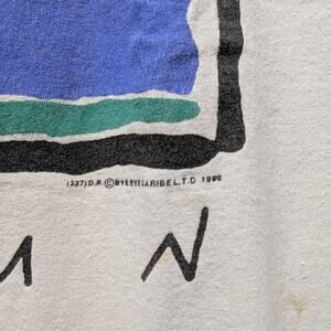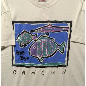Description: Vintage 1988 Bye Bye Cancun Location T shirt, front graphic only, white pueple and green, fish tropical artwork, Bye Bye Caribe, tourist tee, perfect for summer