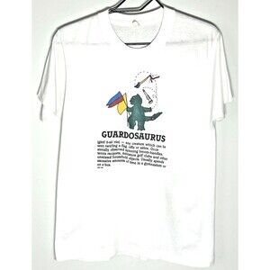 Vintage 1988 WGI Guardosaurus single stitch white short sleeve tee shirt size Adult Small. The material is 50/50 Cotton/Polyester and is lightweight, breathable and just a bit sheer. The screen print is as vivid as the day it was purchased. The message is oh so accurate if you have ever twirled, spun, or tossed a flag, rifle or sabre whether in WGI, BOA (MBA back in the day) or DCI. And the bandaid on the tail is a perfect representation of the cuts, scrapes, bruises color guard members often sport.