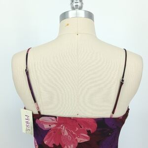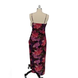 front slit, lined, square neck, adjustable straps. Elegant dress with vibrant floral design. Features pink and purple flowers. Perfect for any occasion.