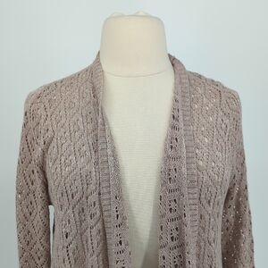 This elegant mauve open-front sweater is perfect for layering, waterfall hem, long sleeves, stretchy. Its intricate knit design adds a touch of sophistication to any outfit.