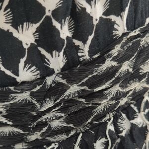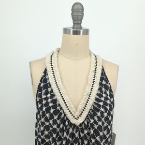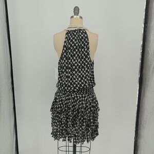 Stylish black and white halter dress with a unique pattern. fringed detail, v neck, drop waist. Features a textured neckline.