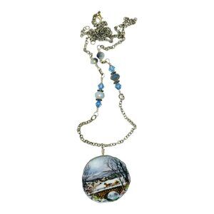 In the whimsical snowscapes of a bygone era, this 1989 Avon necklace tells a story of festive cheer and nostalgia. Crafted from broken china, the pendant captures a timeless scene of a horse-drawn sleigh. Multifaceted crystal beads shimmer like freshly fallen snow, adding a touch of sparkle to this vintage treasure.