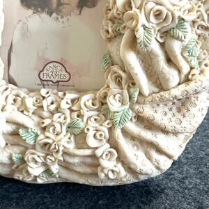 Vintage 1989 Fancy Frames by United Design Corporation picture frame featuring an ornate lace and rose motif. This beautiful piece showcases intricate layers of cream-colored roses, draped fabric textures, and soft green leaf accents for a romantic, Victorian-inspired look. Perfect for displaying portraits, wedding photos, or vintage prints.