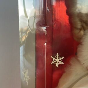 1989 Holiday Barbie Special Edition NIB box has original sticker on top. This year was the 2nd year in the Holiday Barbie collection making her very rare. Barbie is a vision in white in this fabulous tulle gown with a faux fur-trimmed overskirt and stole. Her long blonde hair is curled in ringlets, and accented by a snowflake-decorated hair band that matches the accompanying snowflake ornament. 1989 Special Edition Happy Holidays Barbie includes gown with furry trim, glittery underskirt, furry stole, necklace, earrings, ring, hair decoration, hairbrush, shoes, snowflake ornament, doll stand, and poster. Box has some minor wear and the window has yellowed. Doll is pristine and NRFB.