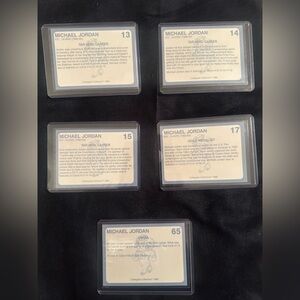 The product is a set of 5 1989 Michael Jordan trading cards from the Collegiate Collection's North Carolina's Finest set. These basketball cards feature the legendary player during his time with the North Carolina Tar Heels in the NCAA. Each card showcases Jordan in action and is a must-have for any basketball card collector or fan of the iconic athlete. This set is a valuable piece of sports memorabilia that captures a significant moment in Jordan's career. # 13, 14, 15, 17, 65. In great condition!!!