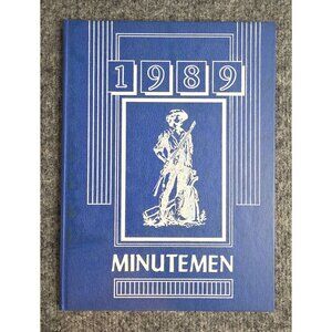 This 1989 Minutemen Yearbook, Volume 14, offers a nostalgic look back with candid photos, student portraits, and staff insights. The hardcover features a distinctive blue and white cover with a Minuteman illustration. It serves as both a historical and sentimental piece from the time it captures.