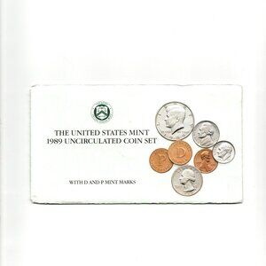 1989-P&D Uncirculated Set... 10 Coin Set... Set Includes (2) Lincoln Pennies P&D, (2) Jefferson Nickels P&D, (2) Roosevelt Dimes P&D, (2) Washington Quarters P&D, (2) Kennedy Half Dollars P&D, and (2) US Treasury Medallions P&D... In Original US Mint Packaging with Spec Sheet... Pre Owned... See Photos... Ships USPS