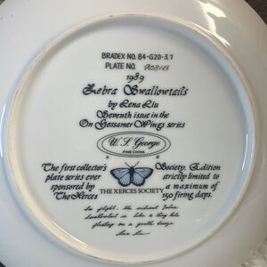 1989 W.S. George Plate”On Gossamer Wings" Series,Plate# 9281B Zebra Swallowtails