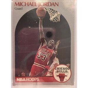 This vintage 1990 Michael Jordan #65 NBA Hoops trading card is a must-have for any basketball fan. The card features an original, licensed reprint of the legendary player during his time with the Chicago Bulls. It has been professionally graded by EMC Graded Mint 9, ensuring its authenticity and quality.The card is part of the 1989-90 NBA Hoops set and is a true collector's item. With attributes such as the player's name, team, card number, season, and country of manufacture, this sports trading card is a valuable addition to any collection. Don't miss out on the opportunity to own a piece of basketball history.