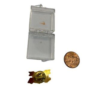 Clear case has minor scratches. Pin measures approximately 1 inch wide.