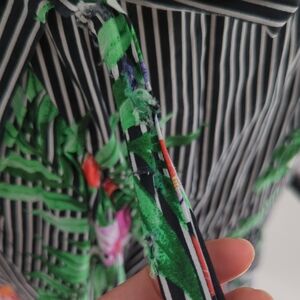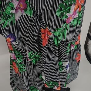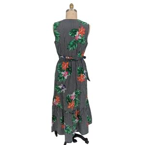 Black and white striped sleeveless dress with vibrant floral print. ruffle high low hem, tea length. Features green, pink, and purple accents.