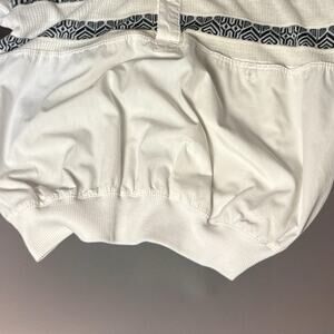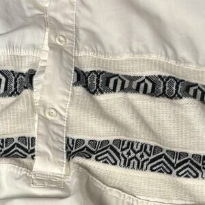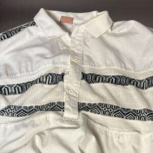 THIS SHIRT BOASTS GEOMETRIC DESIGN WITH A WAISTED BAND AND THREE BUTTON.
