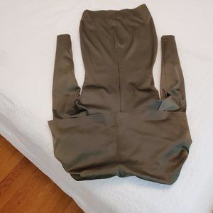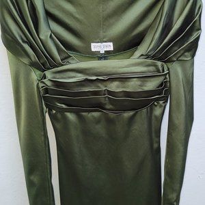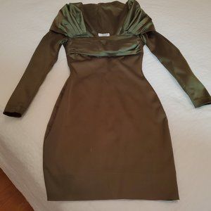 THIS IS A DRESS THAT WAS PURCHASED BACK IN THE EARLY 90'S. THE LABEL READS SOPHIE SITBON - PARIS. THE SIZE IS A 36. IT IS A SATIN TYPE MATERIAL BUT IT HAS A STRETCH TO IT. THERE IS A BACK ZIPPER AND A LARGE WRAP-AROUND COLLAR. NOTE THAT THERE IS A VERY THIN LINE MARK ON THE FRONT OF THE DRESS NEAR THE HEM LINE THAT IS 3/4" AND SEVERAL OTHER SMALL MARKS ON SLEEVES. TRUTHFULLY, IT DOES NOT DETRACT FROM THE DRESS. THE DRESS WAS WORN TO JOHN SEDACCA'S WEDDING. PLEASE SEE PICTURES OF NOTED ISSUES. THIS DRESS IS KILLER ON! ORIGINAL PRICE $1,200.