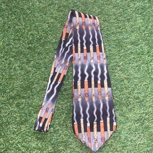 Black and grey neck tie with graphics of burning cigars on it