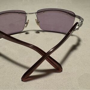 Rare and chic late 90s BARRY KIESELSTEIN CORD purple and matte silver oblong / rectangle novelty rimless sunglasses! The hinge of each side of the frames feature the brand’s signature alligator.