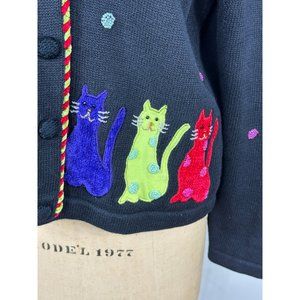 Whimsical cardigan by Berek featuring multi-colored cat appliques that have been embellished with beading. Their faces are so cute and they all have different beaded patterns on their coats. Some are chenille and some are made of a knit fabric. There is a red and green chenille rope trim along the neckline and down the front. The sweater closes with chenille covered buttons. The designer was Takako Sakon. Size L. Excellent condition.