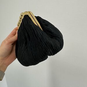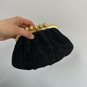 1990's Black Ruched Glamorous Clutch Hinge Opening Gold Tone Hardware