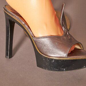 The shoes are in good condition, wear on the soles and insoles, some scuffing on the platform heels. The are a silver leather top and black plastic bottom. High heels, but also a decent platform. Made by Charles Jourdan. Marked a size 7 1/2 M and measures 25 cm insole, 12 cm heel, 3 cm platform.