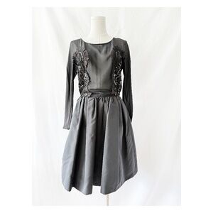 Striking black dress by Christian Lacroix, Features a sheer top with long sleeves and lace and sequin appliqué at the sides covering the breasts, risqué but also modest! Falls into a bubble skirt with POCKETS! So chic. I think this dress wants to hang at the waist/ hips and not sit at the waist like it does on this dress form. You can see at the back better what I mean the buttons all the ay down the back( !) get bunched up because the dress can't fall past the hips. there is also an inner hidden "belt" that may be there so that the dress doesn't move around. Please check the measurements below