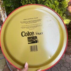 Round serving tray featuring a vintage Coca-Cola design. Red and blue colors with classic artwork.