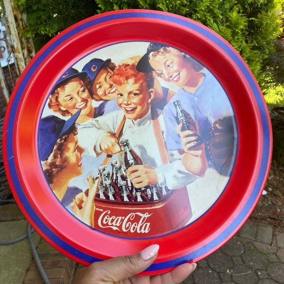 Round serving tray featuring a vintage Coca-Cola design. Red and blue colors with classic artwork.
