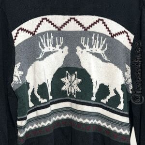 This vintage 1990s Dockers sweater features a classic Fair Isle knit with a festive moose and snowflake motif, often worn as a holiday or Christmas sweater. Made of 100% cotton, it offers a soft, breathable feel with a traditional crew neck and ribbed cuffs for a comfortable fit.