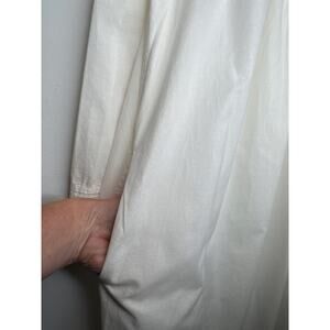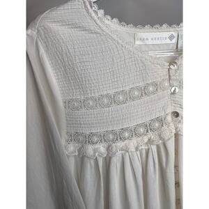Romantic 1990s Eileen West nightgown in soft white 100% cotton with lace trim, pintuck detailing, and delicate floral embroidery. Features pearl-style buttons, long sleeves with lace cuffs, and a flowy ankle-length silhouette. Classic and comfortable with a timeless cottagecore feel. Preowned with light normal wear and a soft, vintage drape.