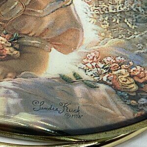 1990s Enesco Via Vermont Sandra Kuck Art Brass Framed Stained Glass Suncatcher-Ornament. Beautifully designed artwork depicting 2 little girls holding flowers. From Enesco Via Vermont Presents Sandra Kuck Artisan Glass-Artful Ornaments Collection. NOS-(New Old Stock) or Display item from a closed flower & Gift Shop inventory Liquidation. Item itself is new however due to age, possible oxidation may have occurred, and it or its Packaging may have dust, soil, tear, missing part or other imperfection. Selling as is/as found, no cleaning or testing is done. *SEE PICS-They are part of the description. *I make every effort to sell only authentic merchandise. Returns MUST be EXACT item(s), EXACT weight, returned in original ship to packaging. Questions? Just Ask!