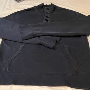 An extremely versatile piece from J CREW: This navy mock neck with a kangaroo pocket can be used over a t-shirt or over a button-down. No stains, no rips...has a slight stonewashed effect. Although the picture appears to have dark spots, the color is uniform.