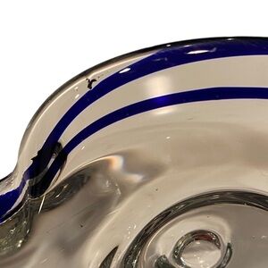 Lillian Vernon Art Glass Crystal Clear Bowl with Cobalt Blue Striped Ruffled Rim
