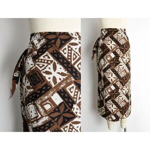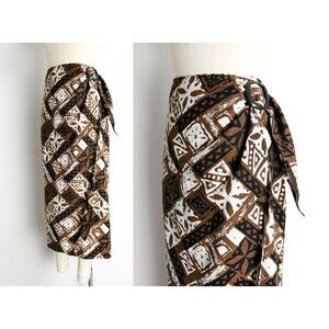 A gorgeous 1990s skirt featuring block print style pattern in white, black, and brown with wrap waist, belt buckle and button closure at waistline, and midi or maxi length depending on your height.