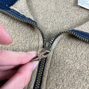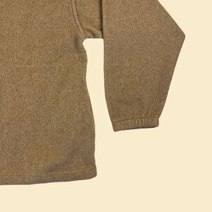 Vintage fleece jacket, manufactured ca. 1990s by Northwest Territory. This brown/beige toned jacket features blue trim on the collar and a quarter-zip style closure with a leather pull. Size M.