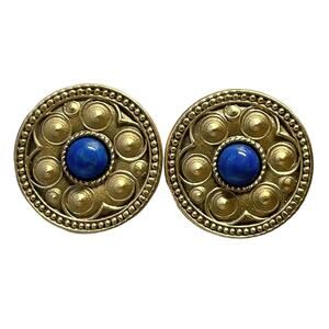 1990s MFA Gold Plated Glass Blue Lapis Embossed Circular Clip Earrings