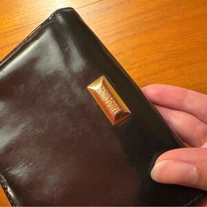 This chic wallet has been worn but is in good vintage condition. Patient leather exterior and leather interior. Interior has a chic leather contrast. Hardware is gold plated. Plating is slightly faded. Wallet is 5.5x3.5”.