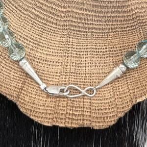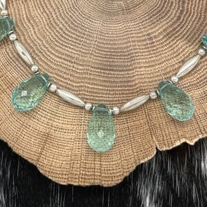 This elegant and unique vintage Native-made sterling silver necklace showcases five faceted teardrop-shaped chalcedony beads, complemented by sterling silver melon, saucer, and seamless round beads. The necklace also features faceted donut-shaped and nearly round chalcedony beads, adding depth and character to the design. Although the original hook clasp appears to have been replaced with a lobster claw clasp, the piece retains its vintage charm, strung securely on beading wire. This exquisite necklace, with its timeless appeal, is a perfect example of vintage Native American craftsmanship, despite lacking a hallmarkβa common trait in older pieces.