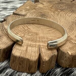 This is a striking vintage Navajo-made sterling silver cuff bracelet. The cuff bracelet features a center section of turquoise chip inlay, creating a beautiful contrast against the smooth silver surface. Its sleek design makes it perfect for everyday wear, whether stacked with other bracelets or worn on its own. The center back is stamped Sterling W, ensuring its authenticity. With an inside measurement of 5.25โ, a gap of 0.875โ, and a total inside circumference of 6.125โ, this bracelet is 0.375โ wide and weighs 20 grams, offering a comfortable and stylish fit.