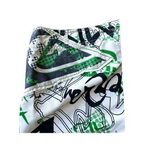 Fantastic 1990s Quicksilver board shorts with a graffiti style print. Made of lightweight polyester. Drawstring waist. Side cargo pocket with Velcro closure. Cool patch sewn on the side extending along the back. Excellent condition. Size 32 waist.