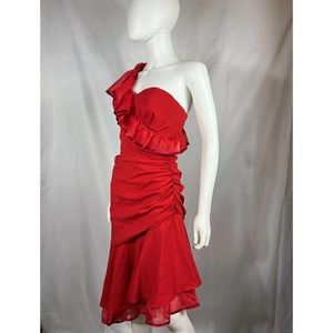 90's Red Flaminco Style Dress. One shoulder, ruffles, ruching, asymmetrical, side zipper. (Slight stain on front near ruching, dry cleaners should be able to get out.)
