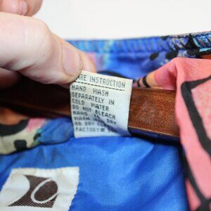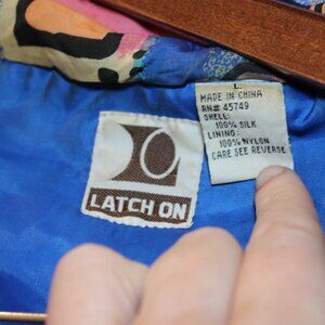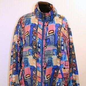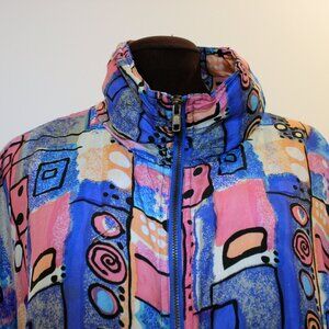 A 1990s vintage track suit jacket with pink interior lining. Abstract geometric printed silk fabric. Elastic around sleeves and waistband. Baggy ocersized fit.