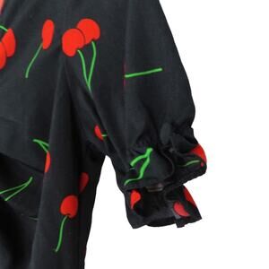 Circa 1980s 1990s Vintage Dress with Cherry Pattern. Retro Chic Black Short Sleeve Dress with Puff Sleeves, Button Front, and Sweetheart Neckline. Red Cherry Fruit Pattern. Gathered Waist, V-neck, & Flirty Fit A-Line Retro Cherry Dress. Casual or Semi Formal. Modeled Photo is Actual Item For Sale.